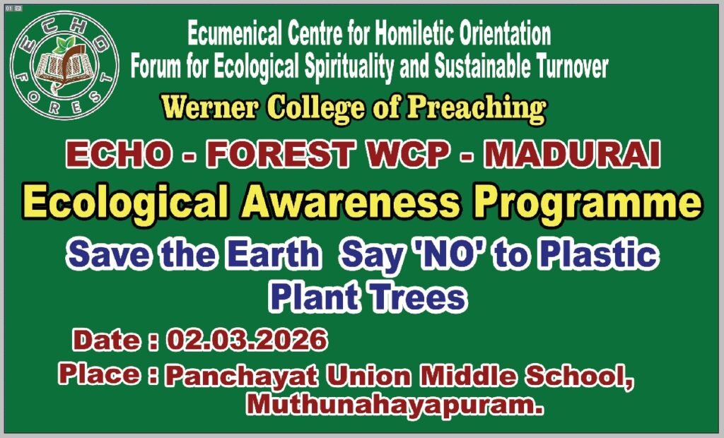 Ecumenical Preaching Centre for Homiletic Orientation and Forum for Ecological Spirituality and Sustainable Turnover (ECHO-FOREST) is committed to develop and promote skills in preaching focusing on various aspects and areas of preaching.